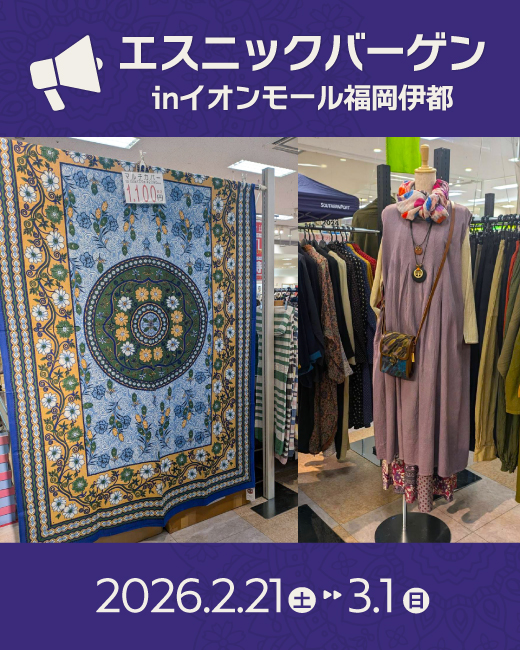 春の訪れまで、まだいくらか日があるようです。 さて、✨エスニックバーゲン✨のお知らせです。 今回はイオンモール香椎浜さん ...